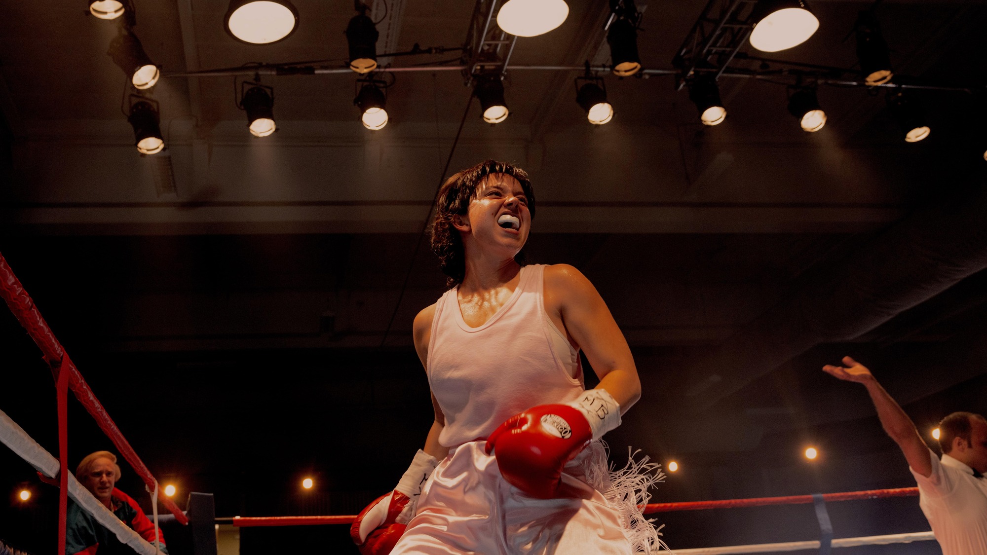 From the outset, Christy is forced to suppress her sexuality by her family and her trainer, Jim Martin. Early girlfriends are squeezed out of the picture, and Jim’s hold is tightened as he wears her down into a marriage that becomes controlling and violent. Ben Foster as Jim, and Merritt Weaver as Christy’s mother, Joyce, are standout castings, continuing to show themselves among the best character actors working today. Foster embodies a dead-eyed menace, while Weaver impresses with an unsettling turn as a mother whose soft voice masks the cruelty of her denial. Katy O’Brian is also a welcome addition as one of Christy’s boxing rivals, but is afforded less screen time than she deserves.